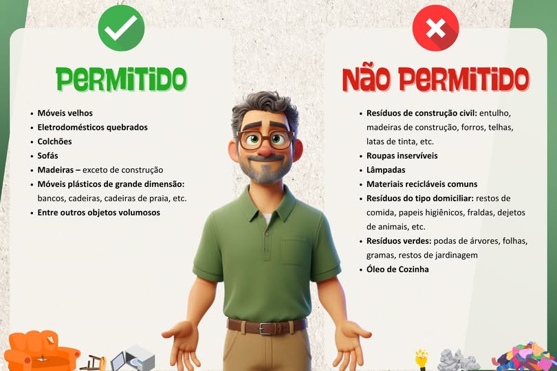 Itens Aceitos: Móveis quebrados, sofás, colchões, eletrodomésticos, objetos de madeira (exceto de construção) e plásticos de grande dimensão (cadeiras de praia, bancos).