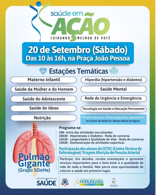 Promovido pela Prefeitura da Estância Climática de Morungaba, por meio das equipes do Departamento de Saúde, o “Saúde em Ação” será uma grande mobilização em prol da conscientização e do cuidado com a saúde da população e contará com diversas estações temáticas, conduzidas pelas equipes de profissionais da saúde.