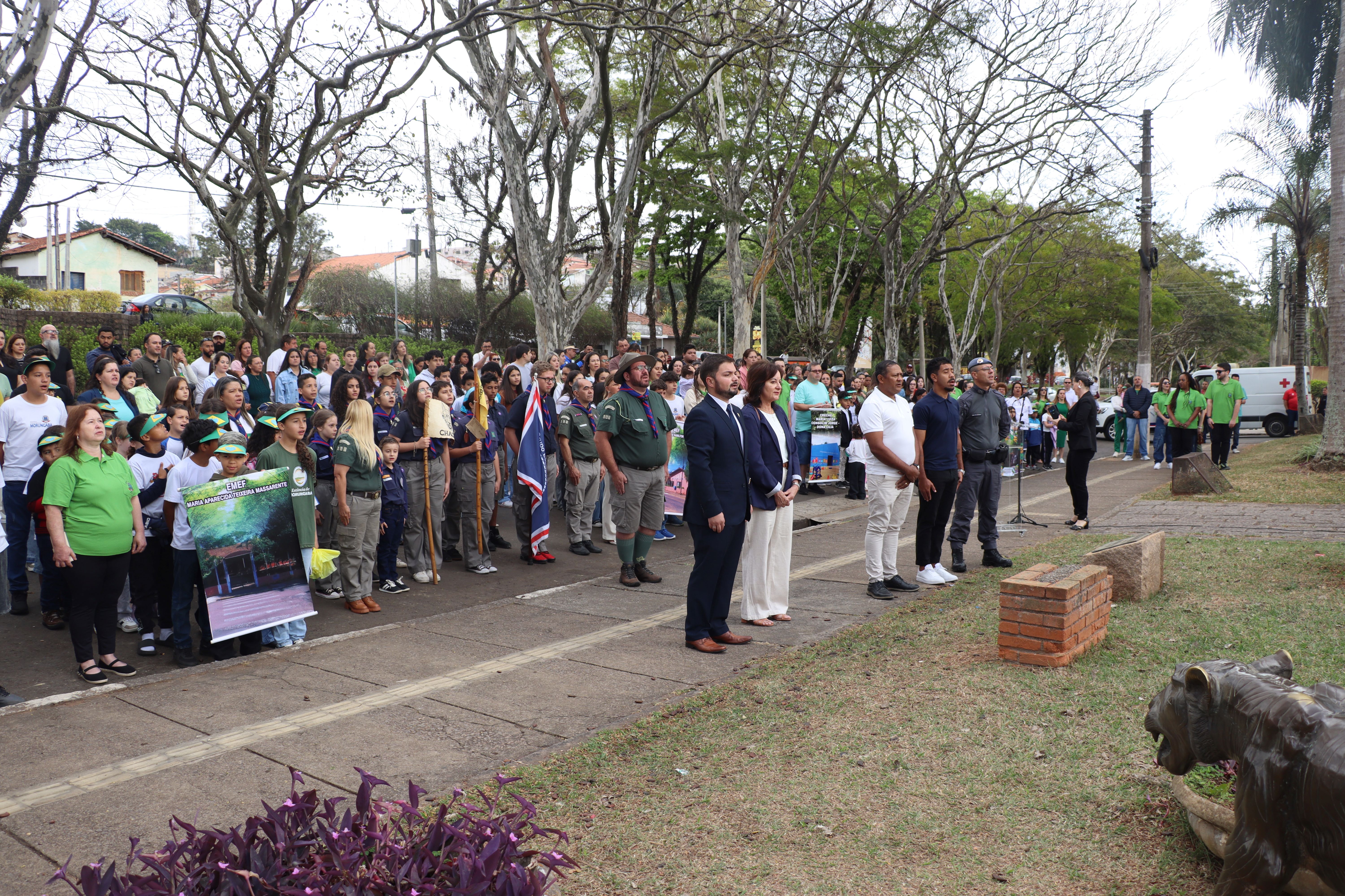 Participaram do evento os estudantes de todas as unidades escolares da rede municipal, das escolas particulares e da Apae, além dos integrantes do Grupo Escoteiro Rota das Estâncias.