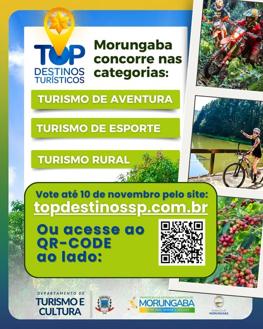 Até o dia 10 de novembro, a votação será realizada pelo site: https://topdestinossp.com.br/. Basta selecionar a categoria desejada e escolher Morungaba como destino favorito.