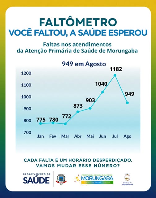 O Departamento de Saúde da Prefeitura de Morungaba divulgou o balanço do “Faltômetro” referente ao mês de agosto, que registrou 949 ausências em atendimentos da Atenção Primária à Saúde. O número representa uma redução de 19,7% em relação a julho, quando foram contabilizadas 1.182 faltas, o maior índice do ano até agora.