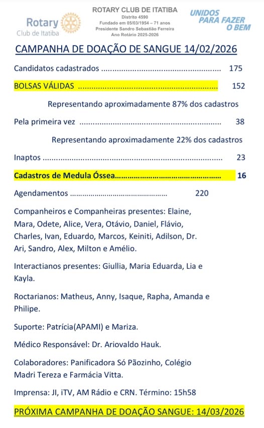 O Rotary Club de Itatiba realizou no último dia 14 de fevereiro a segunda Campanha de Doação de Sangue de 2026, mobilizando a comunidade em mais uma ação solidária de grande impacto.