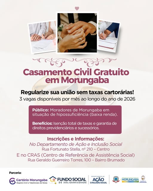 Será promovida em Morungaba uma ação para oficializar a união civil de moradores sem custos com taxas cartorárias. A busca iniciativa promover a cidadania e a segurança jurídica, por meio de uma parceria entre o Cartório de Registro Civil e Tabelionato de Notas, o Fundo Social de Solidariedade e o Departamento de Ação e Inclusão Social da Prefeitura de Morungaba.
