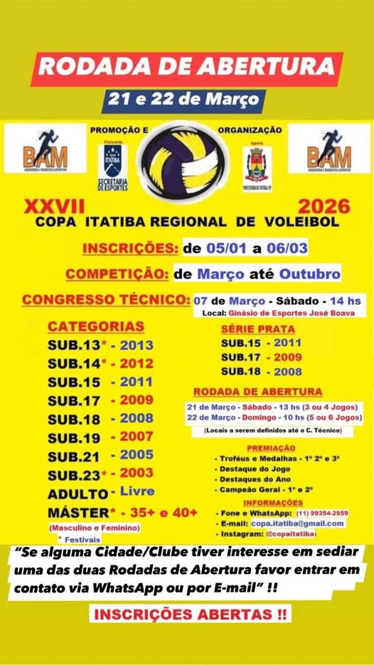 A XXVII Copa Itatiba Regional de Voleibol será disputada ao longo de 2026 e terá sua rodada de abertura nos dias 21 e 22 de março. A competição é promovida com apoio da Secretaria de Esportes e organizada pela BAM, reunindo equipes masculinas e femininas de diversas cidades da região.