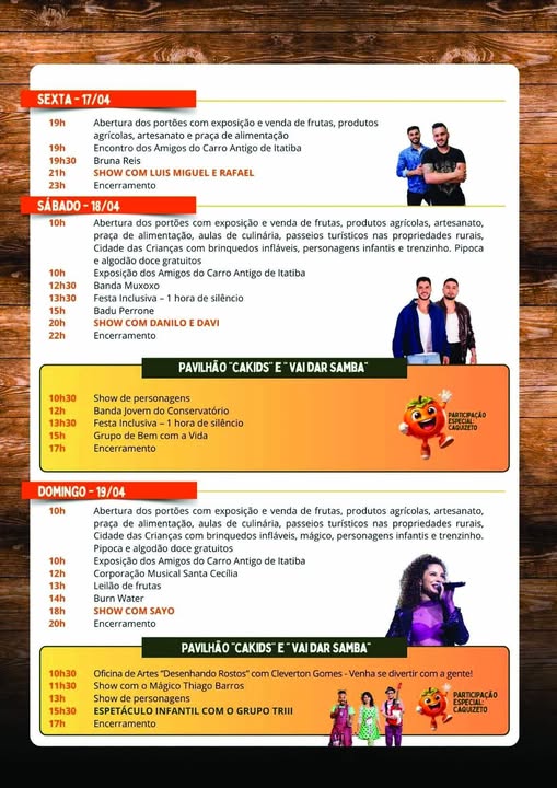 No sábado (18), sobem ao palco principais atrações como Banda Muxoxo, Badu Perrone e o show da dupla Danilo & Davi, um dos momentos mais aguardados da programação. Já o Pavilhão CaKids/Vai Dar Samba oferece atividades exclusivas ao público infantil pela manhã e roda de samba a partir das 15h.