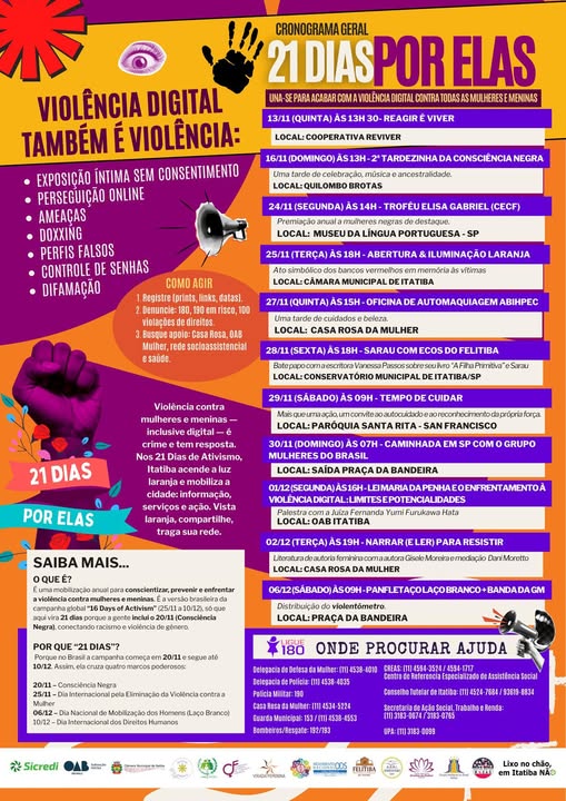 A campanha “21 Dias por Elas – Ativismo pelo Fim da Violência contra as Mulheres” realiza nesta terça-feira, 25 de novembro, às 18h, o Ato de Abertura e Iluminação Laranja, que acontece na Câmara Municipal de Itatiba. A ação marca o início da programação local de mobilização internacional pelo fim da violência contra mulheres e meninas, com foco especial na violência digital, tema central deste ano.