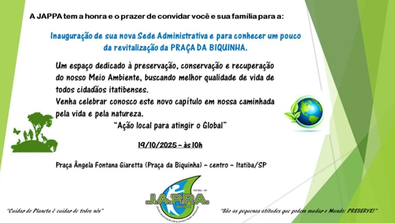 A JAPPA (Jacaré Ribeirão Vivo – Associação para Preservação Ambiental) convida toda a população para um momento histórico neste domingo, 19 de outubro, às 10h, na Praça Ângela Fontana Giarettta (Praça da Biquinha), no Centro de Itatiba. A data marcará a inauguração de sua nova sede administrativa e a apresentação da revitalização do espaço público, símbolo de cidadania, consciência e amor à natureza.