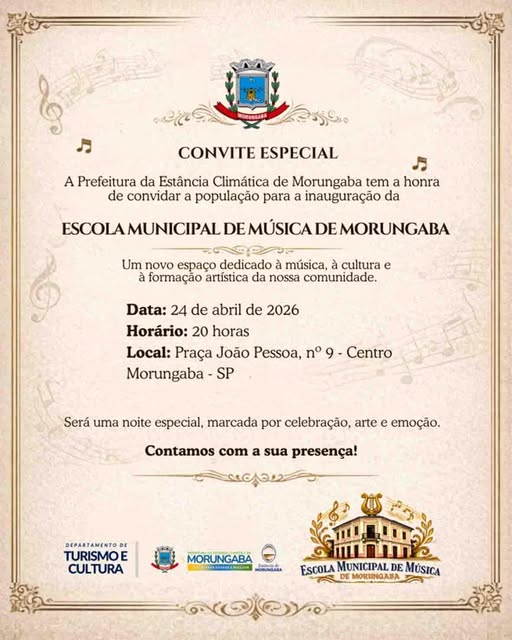 A Prefeitura da Estância Climática de Morungaba convida toda a população para participar de um momento histórico para o município: a Apresentação da Escola Municipal de Música. O novo espaço, dedicado à formação artística e ao desenvolvimento cultural, será apresentado oficialmente à comunidade em uma noite marcada por emoção e apresentações musicais.