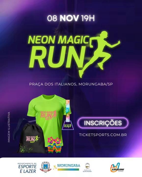 A Uhuw Eventos, com apoio da Prefeitura da Estância Climática de Morungaba por meio do Departamento de Esporte e Lazer, promove no sábado, 8 de novembro de 2025, a Neon Magic Run — corrida noturna que promete muita cor, energia e alegria nas ruas do centro. A concentração será na Praça dos Italianos e a largada acontece às 19h.
