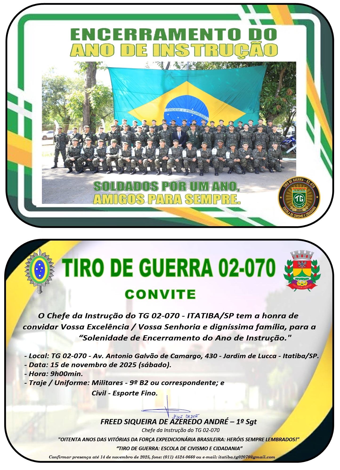 O Chefe da Instrução, 1º Sargento Freed Siqueira de Azêredo André, convida toda a comunidade a prestigiar a solenidade, que reforça o papel do Tiro de Guerra como escola de civismo e cidadania em Itatiba.